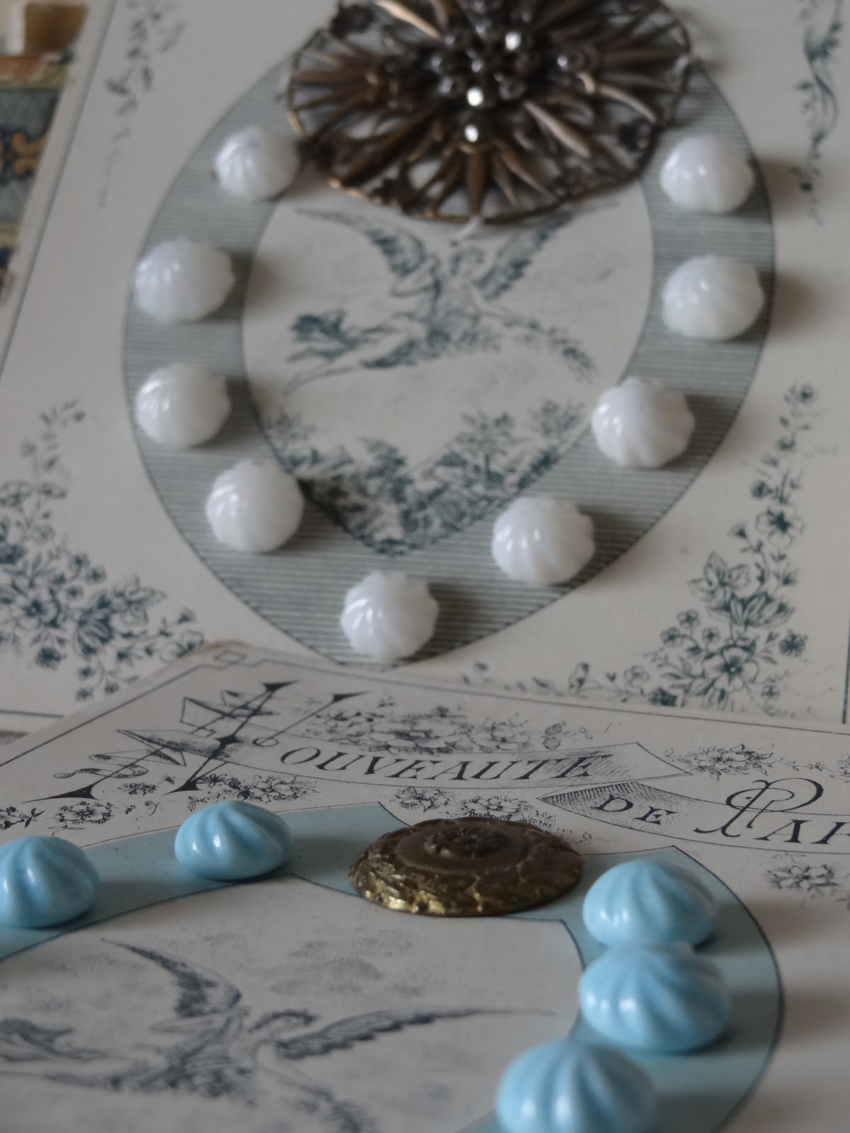 また、お花と植物の小さなメタルボタン1個と、11個のブルーのミルクボタンがセットになったシート1つです。